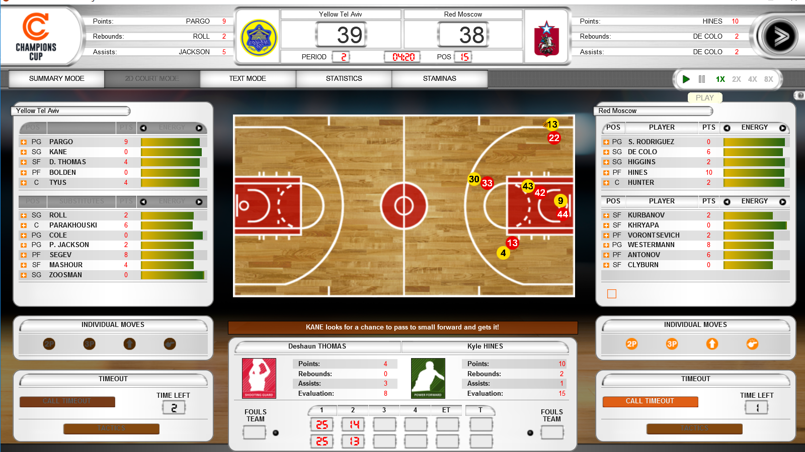 Modo virtual: Sigue el partido minuto a minuto y toma el control de tus jugadores en tiempo real, realizando cambios de tácticas o asignando jugadas específicas a un jugador. Podrás seguir aquellas incidencias que tengan lugar durante el encuentro mediante mensajes de texto o a través de las chapas, donde podrás ver los movimientos ofensivos y defensivos de tus jugadores en la cancha.
