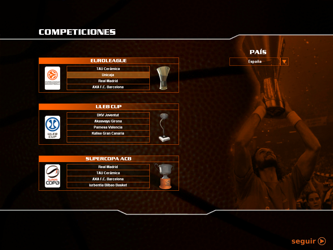 Las competiciones disponibles incluyen tanto torneos nacionales como internacionales. Entre los primeros se encuentran las ligas italiana, francesa, griega y como no, española. Cada una de ellas contempla la principal división del país en cuestión, salvo en el caso de España, en el cual podemos disputar la ACB, LEB Oro, LEB Plata, LEB Bronce y EBA. En cuanto a los encuentros europeos, hay la posibilidad de disputar la Euroleague y ULEB Cup.